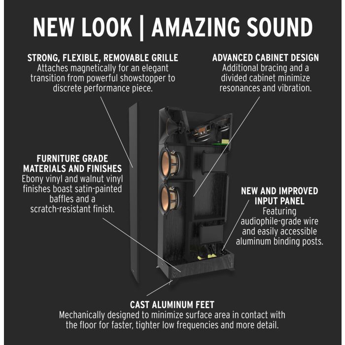 Una característica distintiva de los altavoces de la serie Reference Premiere, el canal principal dual de 8″ (203 mm) y los woofers Cerametallic™ del canal de altura de 6,5″ (165 mm) se han actualizado para una reproducción de sonido absolutamente impecable, distorsión mínima y máxima eficiencia. El woofer rediseñado brindará la potencia, los detalles y la emoción que espera de un altavoz Klipsch Reference Premiere.